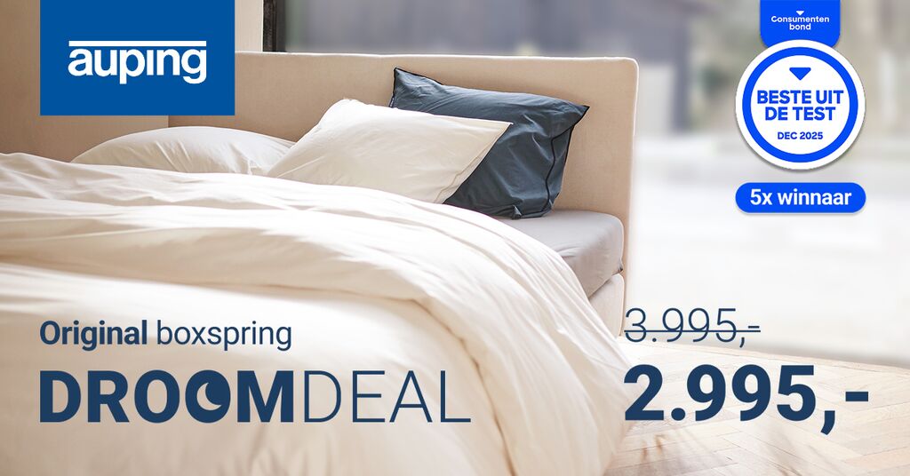 1.000,- voordeel op een Original boxspring; van 3.995,- voor 2.995,-*. Auping producten worden met zorg en vakmanschap vervaardigd in Nederland, Deventer. Dit is jouw kans om te investeren in ultiem slaapcomfort en kwaliteit. Wacht niet langer en ervaar de luxe van Auping voor een gereduceerde prijs!